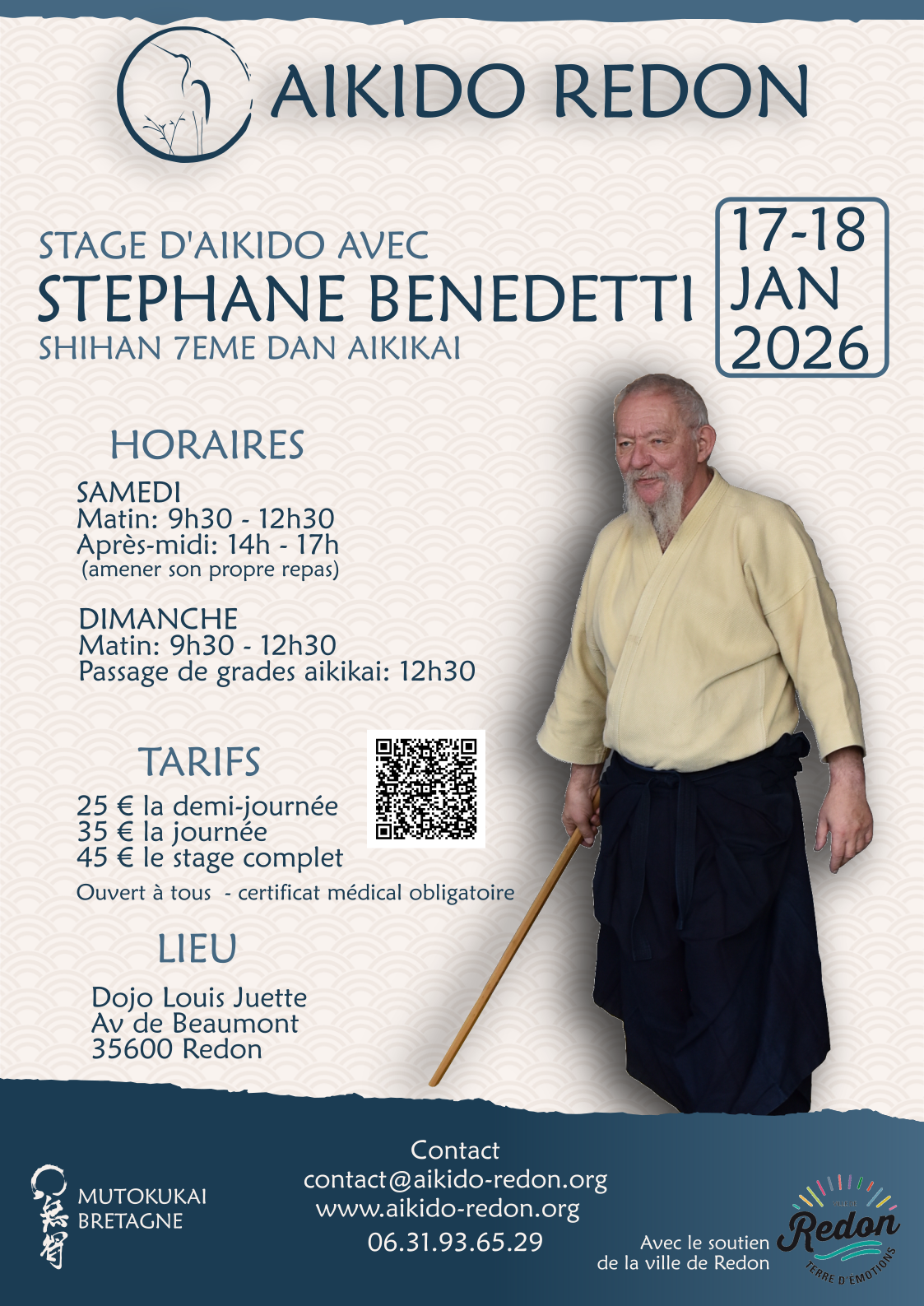 Dojo Louis Juette Dojo Aikido Redon Av Beaumont, REDONRejoignez nous pour un stage sur 3 demi-journées avec Stéphane Benedetti, Shihan 7ème dan Aikikai. Télécharger l'affiche en PDF